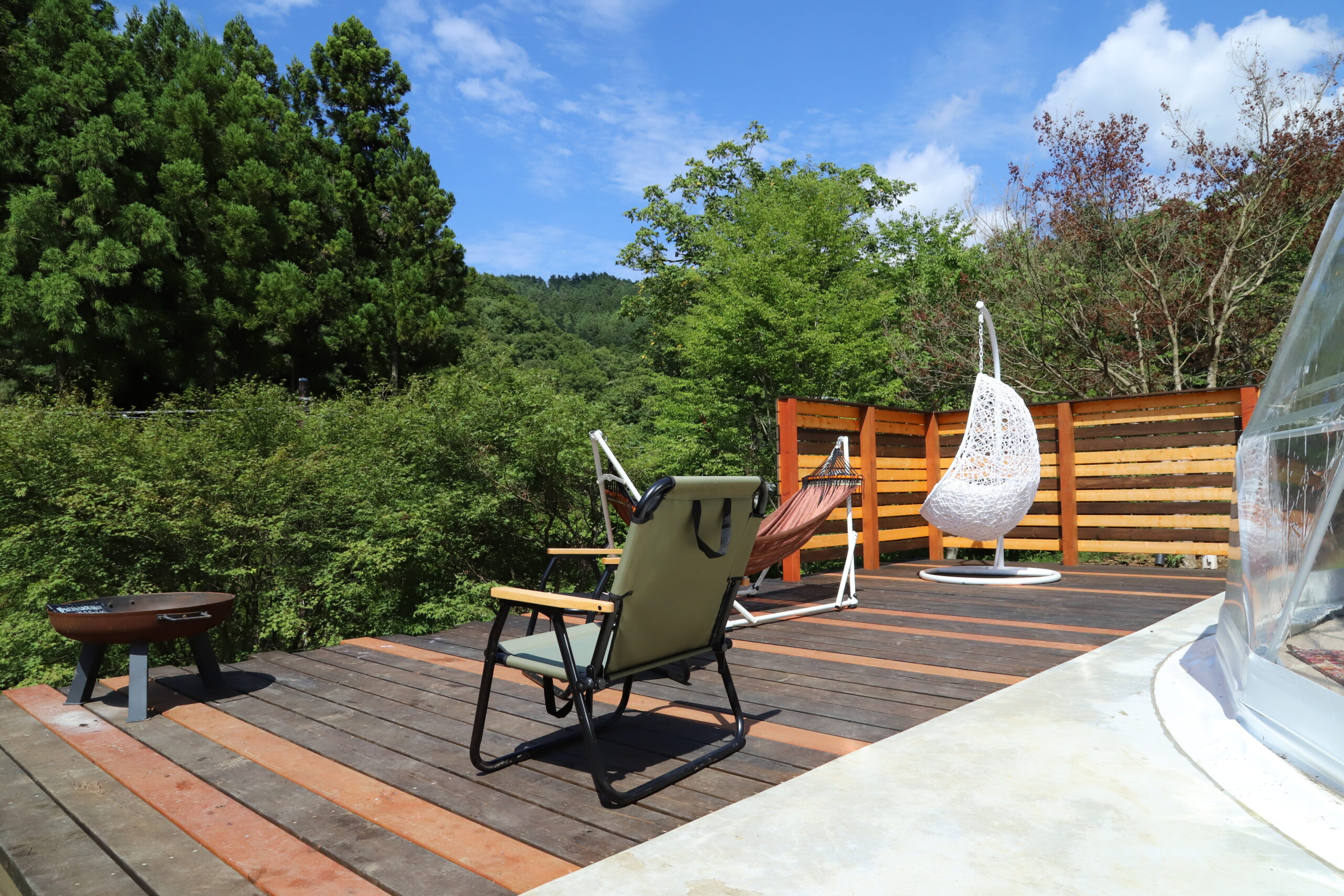都留市の森の中にあるグランピング施設「THE FOREST」。