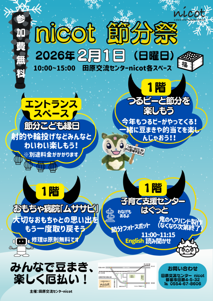 2026年2月1日(日)に田原交流センターnicotで開催される「ニコット節分祭」につるビーが遊びに行きます!